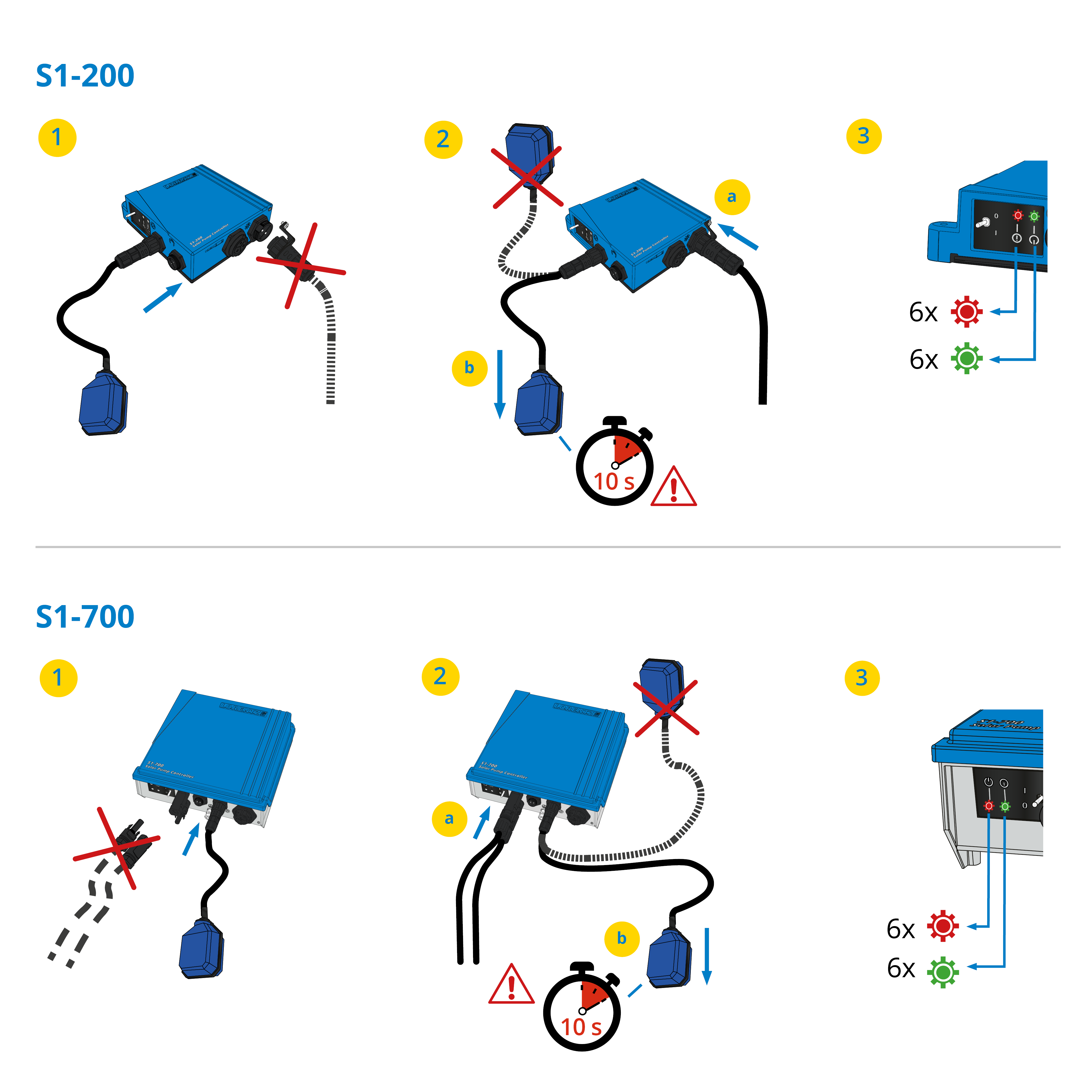 Falls Sie kein Smartphone zur Hand haben und den Schwimmerschalter ohne die S-Connect App aktivieren möchten, folgen Sie diesen Schritten: