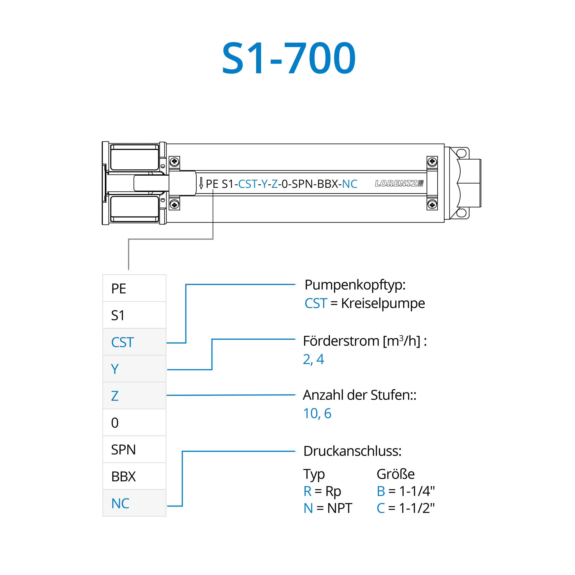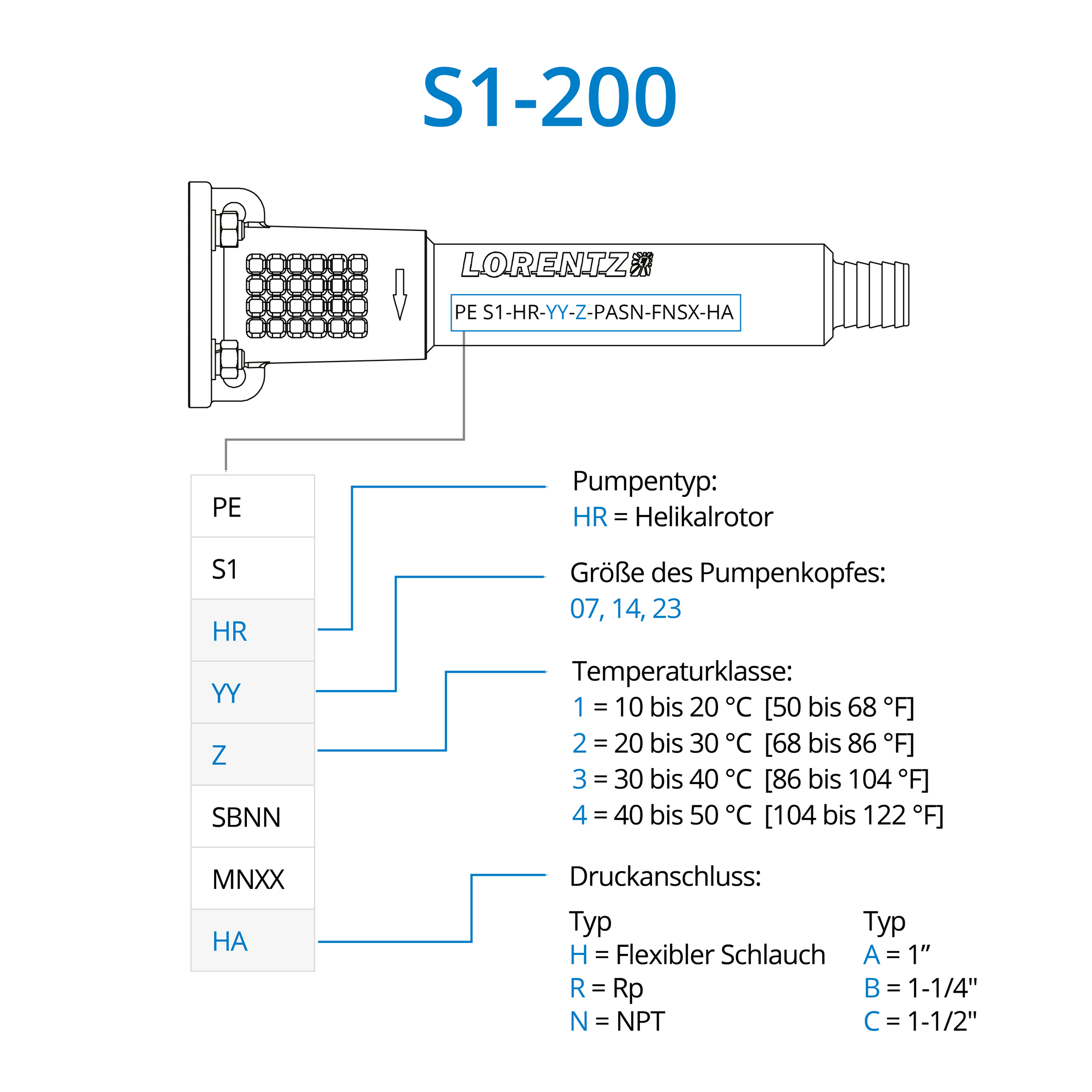 LORENTZ verwendet einen strukturierten Typenschlüssel, um die wichtigsten Eigenschaften des in S1-Pumpsystemen eingesetzten Pumpenkopfes eindeutig zu identifizieren.