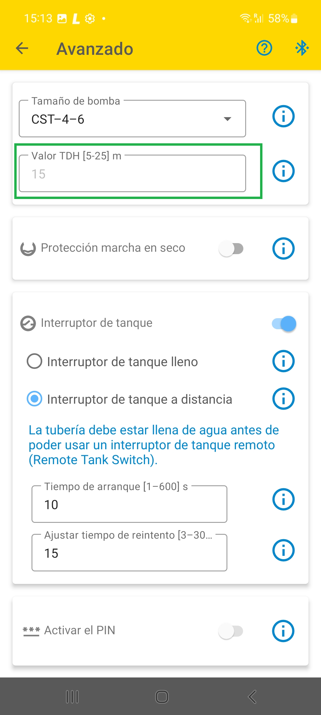 - Seleccione el cabezal de la bomba correcto en "Tamaño de bomba" y luego introduzca la altura dinámica total (TDH) correcta de su instalación (introducir el TDH solo aplica para el S1-700-C, véase la tercera imagen a continuación).