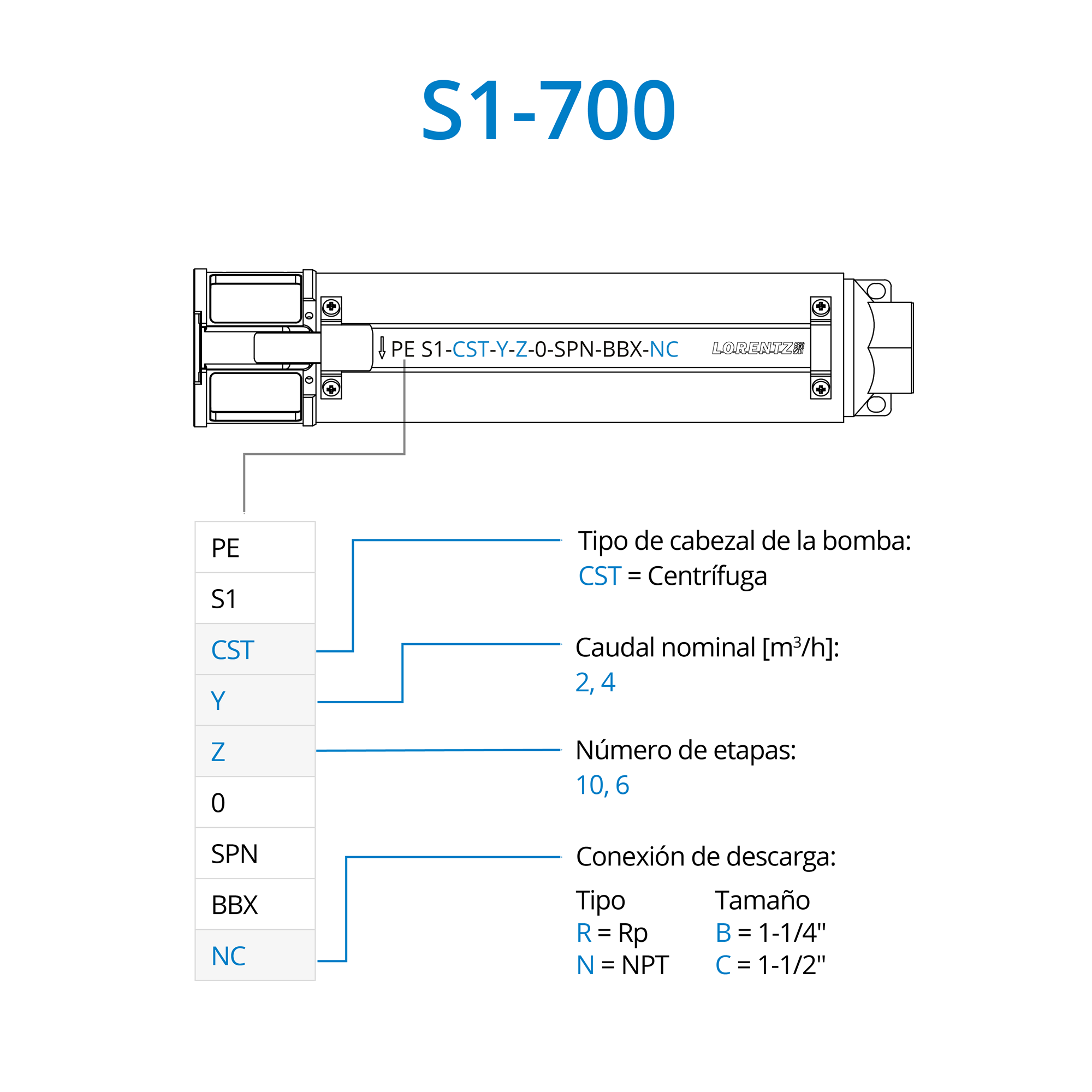 LORENTZ utiliza una nomenclatura estructurada de bombas para identificar claramente las principales características del cabezal de la bomba utilizado en los sistemas de bombeo S1.