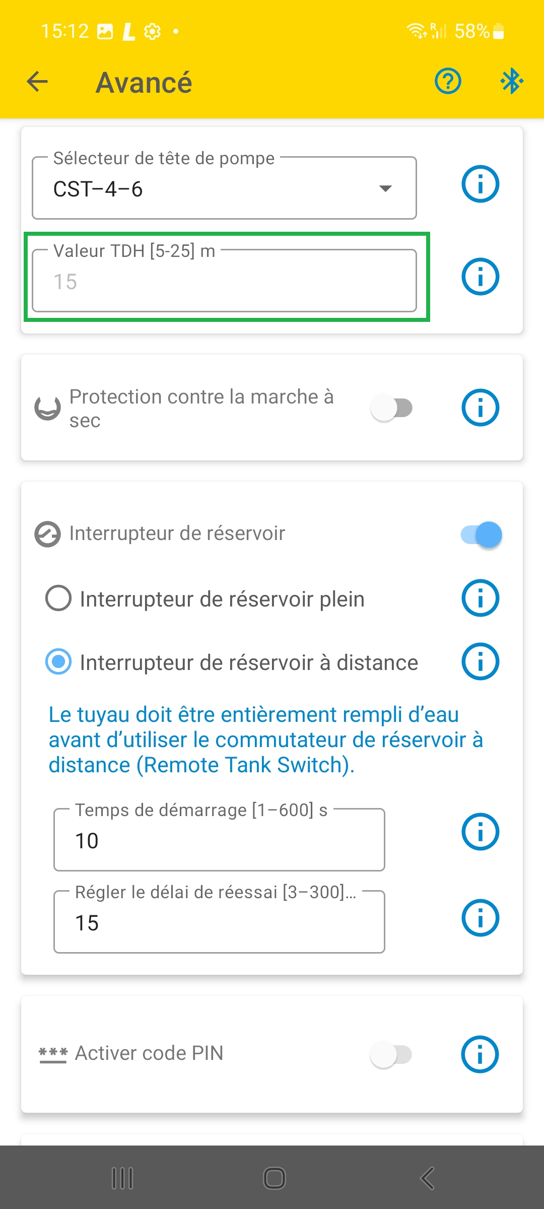 - Sélectionnez la bonne tête de pompe sous "Sélecteur de tête de pompe" puis entrez la hauteur manométrique totale (TDH) correcte pour votre installation (l'entrée du TDH s'applique uniquement au S1-700-C, voir la troisième image ci-dessous).