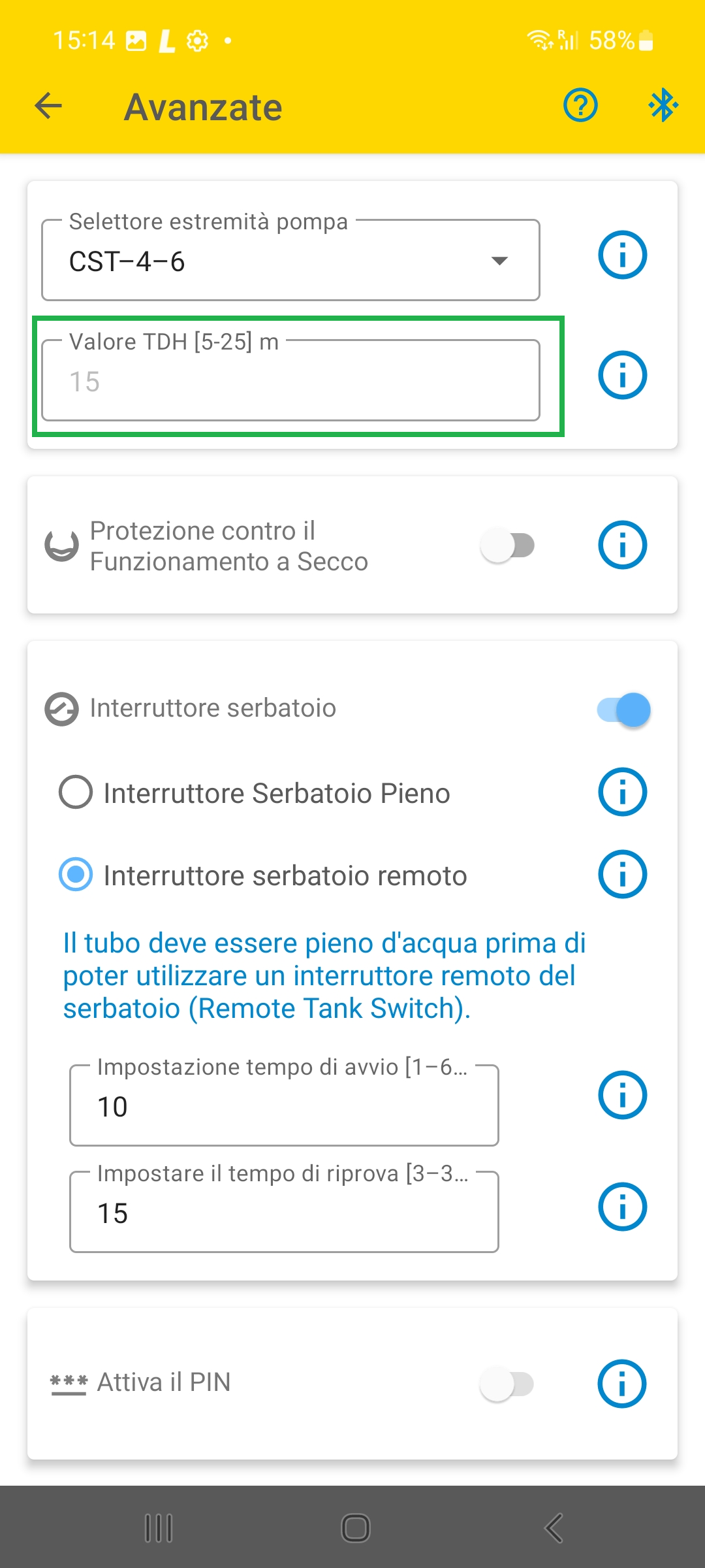 - Seleziona la corretta testa della pompa in "Selettore estremità pompa" e inserisci il corretto valore di prevalenza totale (TDH) della tua installazione (l'ingresso TDH si applica solo al modello S1-700-C, vedere la terza immagine seguente).
