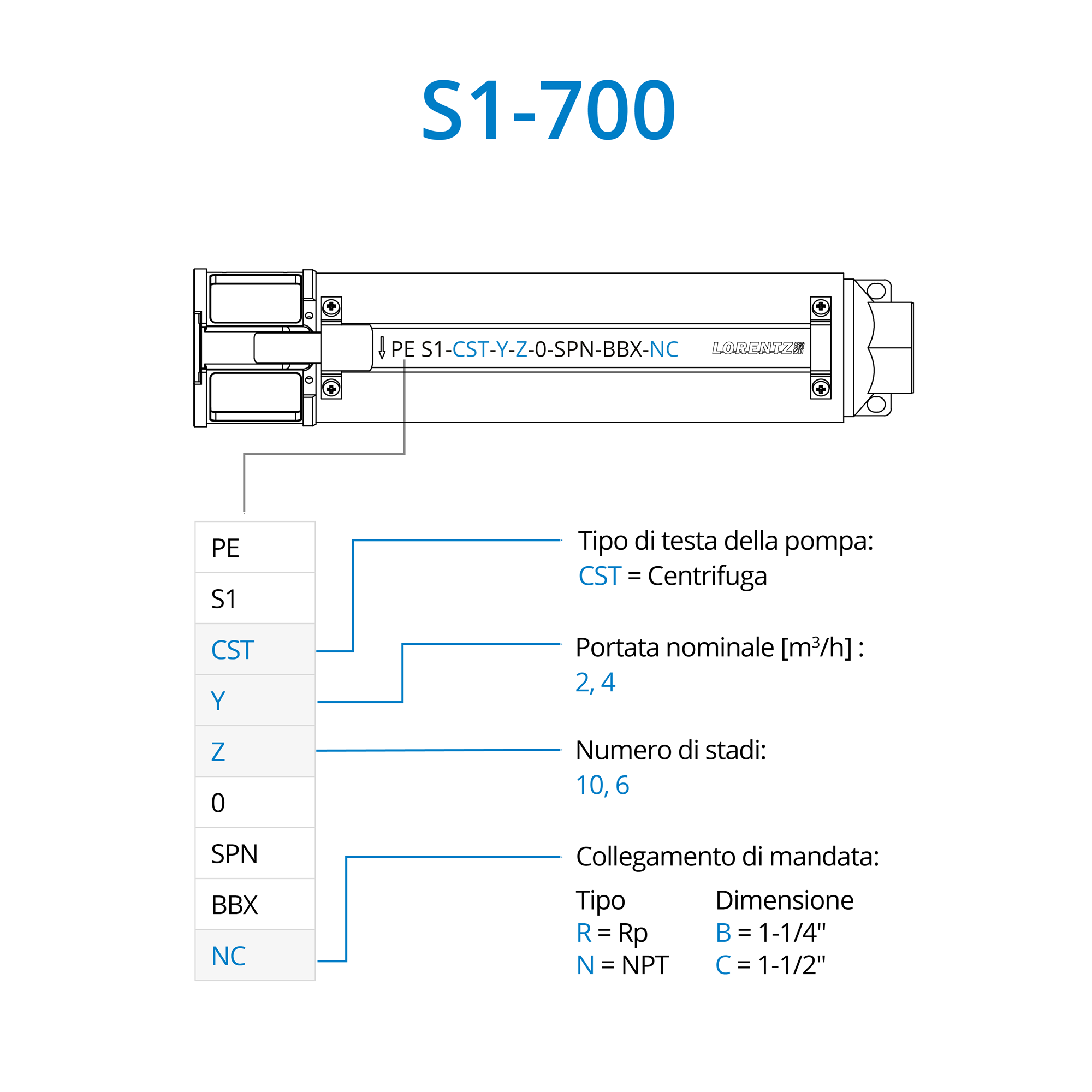La gamma di prodotti S1 comprende due diverse tecnologie di pompaggio, ciascuna con la propria struttura di codici modello: