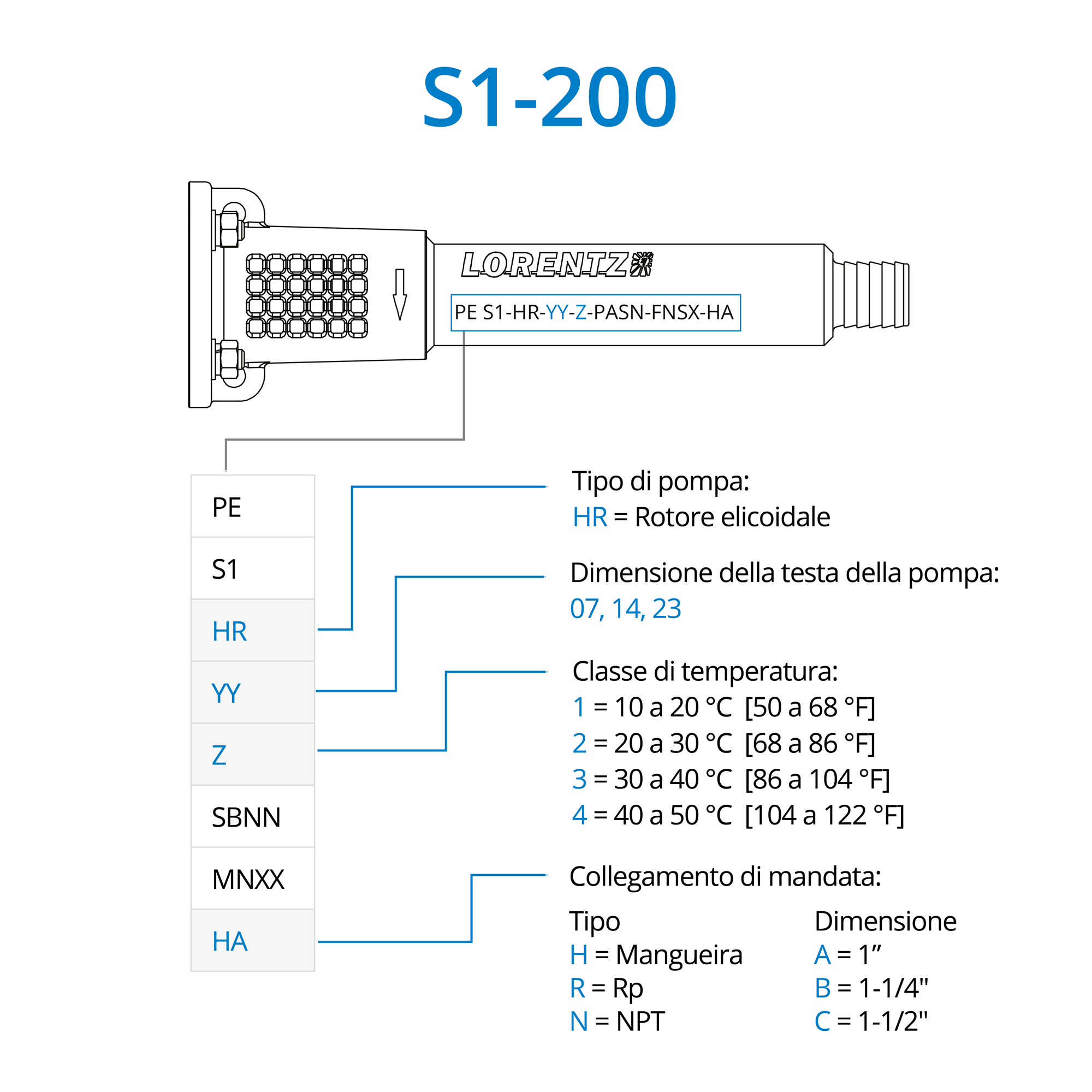 LORENTZ utilizza codici modello strutturati per identificare chiaramente le principali caratteristiche della testa della pompa utilizzata nei sistemi di pompaggio S1.
