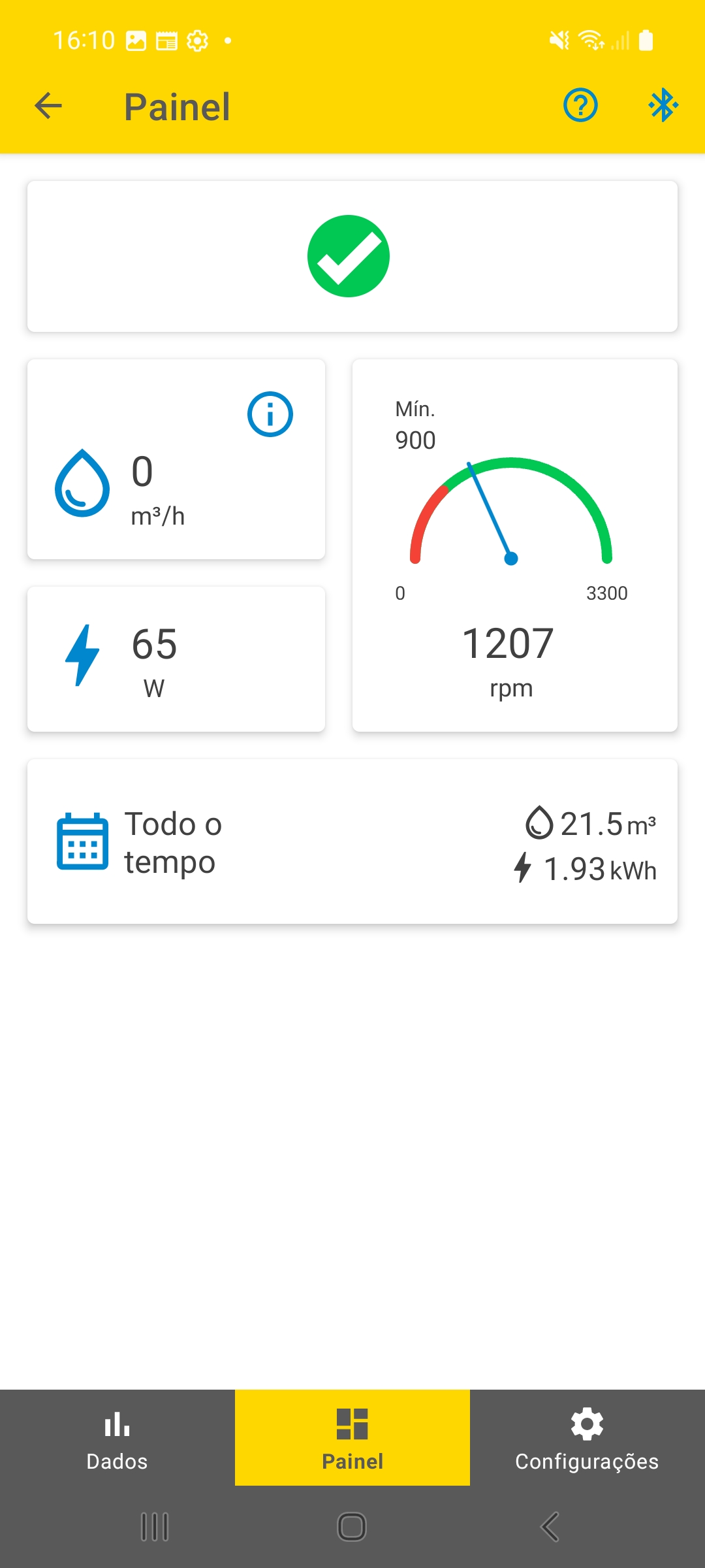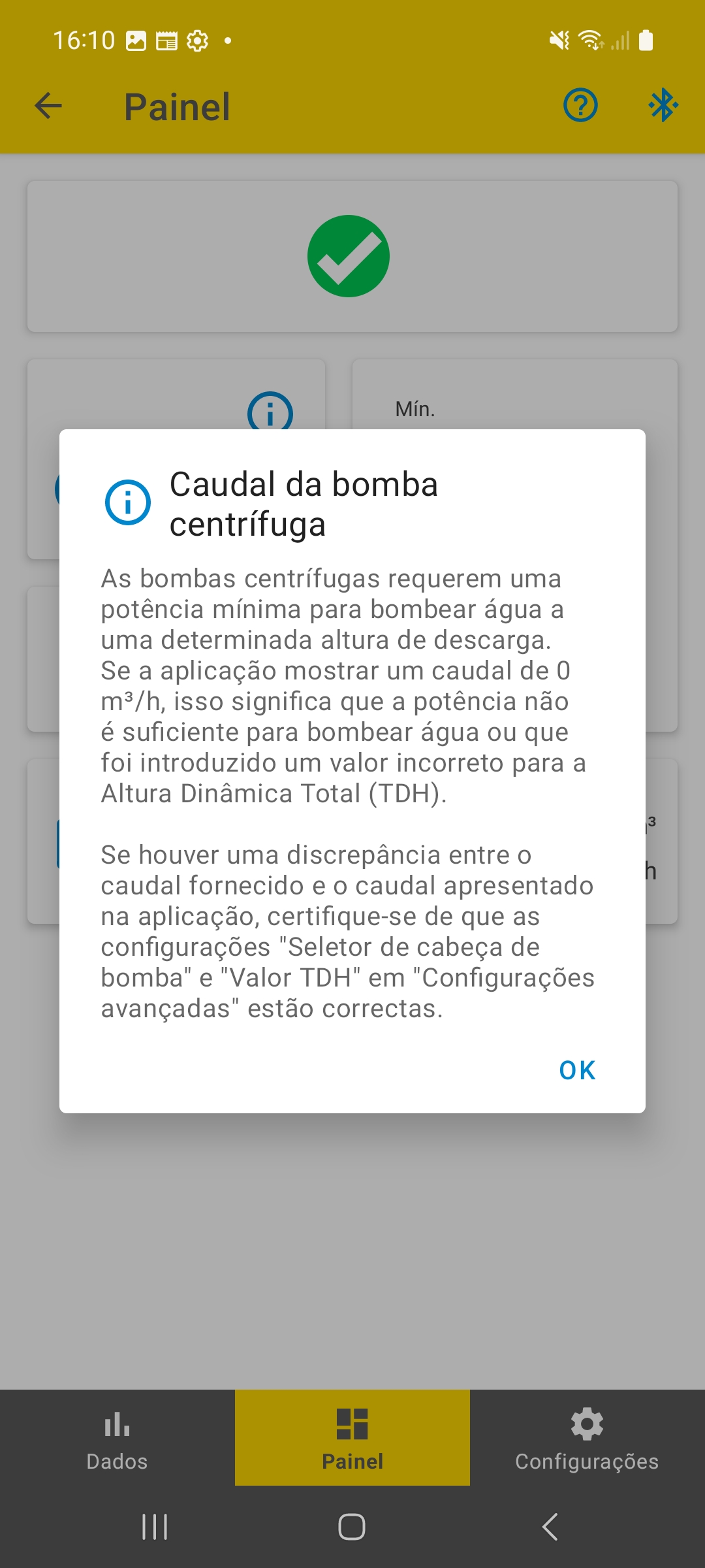 Se a potência disponível não for suficiente para atingir essa velocidade mínima, a vazão exibida no aplicativo será " 0 m³/h " e nenhuma água sairá da bomba.