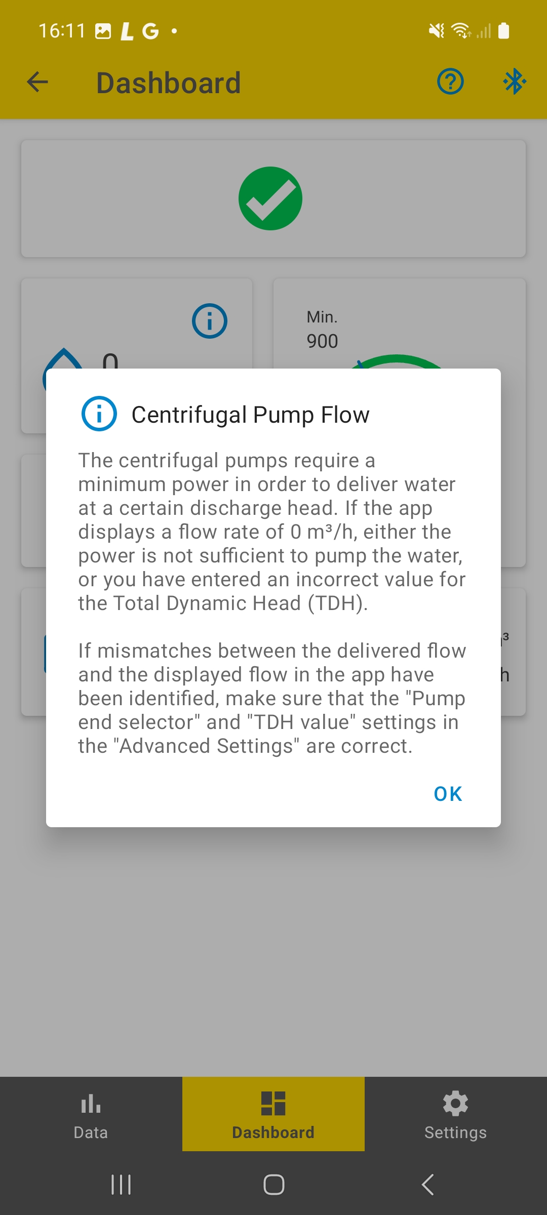 If the available power is not enough to reach this minimum speed, the flow rate shown in the app would be "0 m³/h" and no water comes out of the pump.